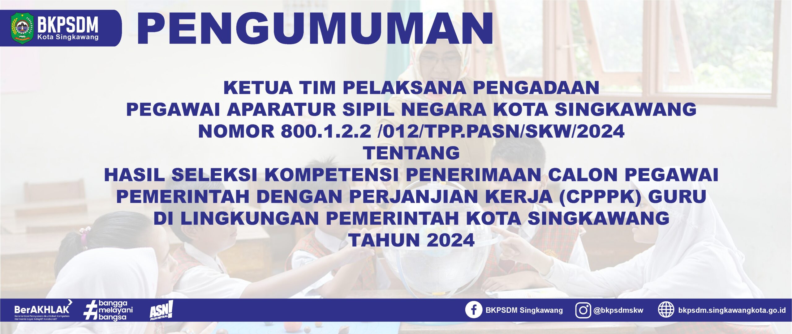 Pengumuman Ketua Tim Pelaksana Pengadaan Pegawai Aparatur Sipil Negara Kota Singkawang Nomor 800.1.2.2 /012/TPP.PASN/SKW/2024 Tanggal 6 Januari 2025, tentang Hasil Seleksi Kompetensi Penerimaan Calon Pegawai Pemerintah Dengan Perjanjian Kerja (CPPPK) Guru di Lingkungan Pemerintah Kota Singkawang Tahun 2024