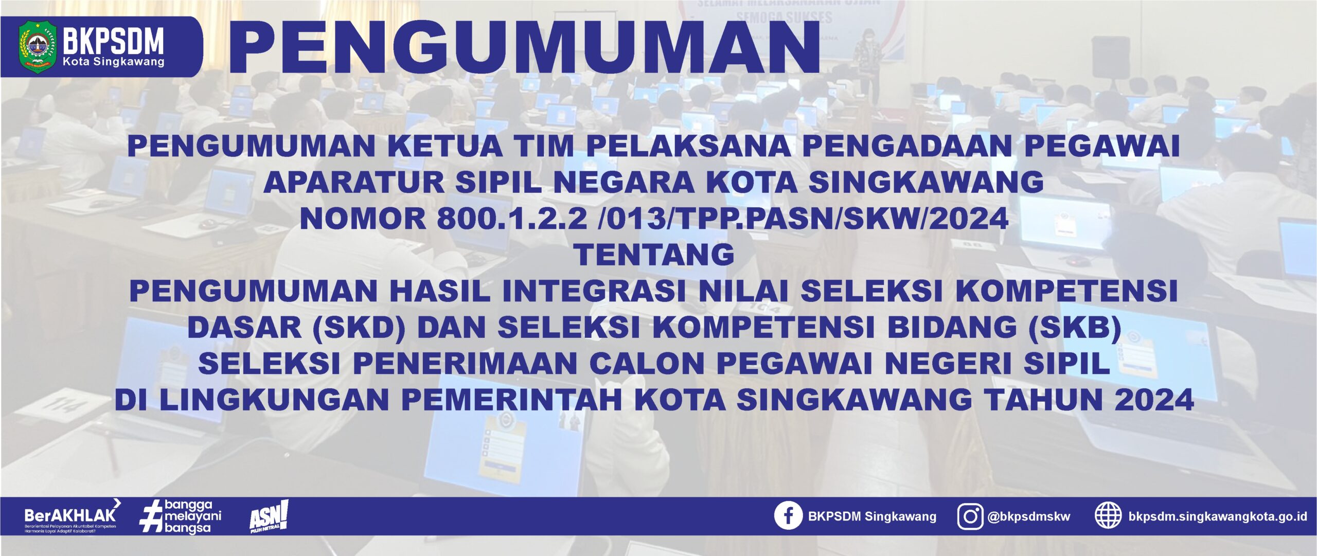 Pengumuman Ketua Tim Pelaksana Pengadaan Pegawai Aparatur Sipil Negara Kota Singkawang Nomor 800.1.2.2 /013/TPP.PASN/SKW/2024 Tanggal 10 Januari 2025, tentang Pengumuman Hasil Integrasi Nilai Seleksi Kompetensi Dasar (SKD) dan Seleksi Kompetensi Bidang (SKB) Seleksi Penerimaan Calon Pegawai Negeri Sipil Di Lingkungan Pemerintah Kota Singkawang Tahun 2024