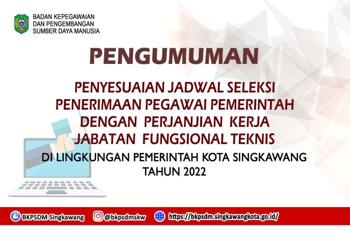 Pengumuman Pj. Wali Kota Singkawang Nomor : 800.1.2.2/287/BKPSDM.MID-A/2022 Tanggal 7 Maret 2023, Tentang Penyesuaian Jadwal Seleksi Penerimaan Pegawai Pemerintah Dengan Perjanjian Kerja Jabatan Fungsional Teknis Di Lingkungan Pemerintah Kota Singkawang Tahun 2022