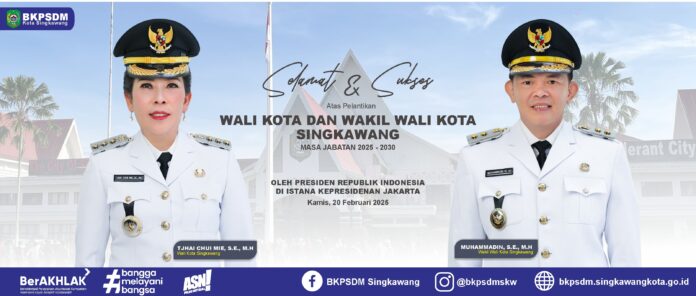 Spanduk Wali Kota dan Wakil Wali Kota Singkawang periode Masa Jabatan 2025-2030 Penulis BKPSDM - 20 Februari 2025 0 61 FacebookTwitterWhatsAppTelegram Selamat dan sukses atas pelantikan Wali Kota dan Wakil Wali Kota Singkawang periode Masa Jabatan 2025-2030 oleh Presiden Republik Indonesia di Istana Kepresidenan Republik Indonesia pada hari Kamis, 20 Februari 2025